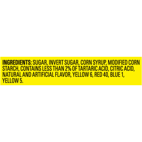 INGREDIENTS: SUGAR, INVERT SUGAR, CORN SYRUP, MODIFIED CORN STARCH, CONTAINS LESS THAN 2% OF TARTARIC ACID, CITRIC ACID, NATURAL AND ARTIFICIAL FLAVOR, YELLOW 6, RED 40, YELLOW 5, BLUE 1.