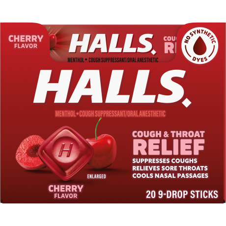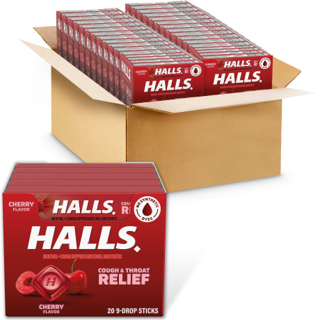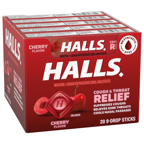 GTIN 00312546624764 HALLS Cherry Flavor Cough Drops: Relieves coughs, soothes sore throats, cools nasal passages. Includes 480/9-ct. packs.