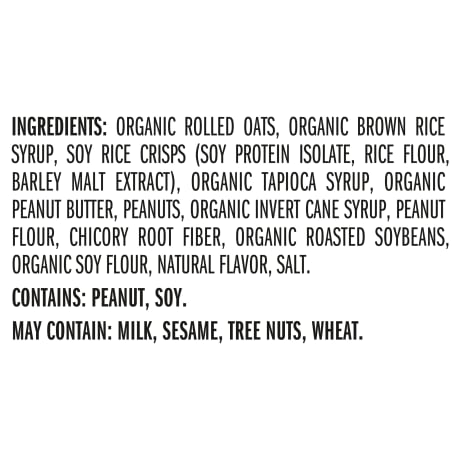 INGREDIENTS: ORGANIC ROLLED OATS, ORGANIC BROWN RICE SYRUP, SOY RICE CRISPS (SOY PROTEIN ISOLATE, RICE FLOUR, BARLEY MALT EXTRACT), ORGANIC TAPIOCA SYRUP, ORGANIC PEANUT BUTTER, PEANUTS, ORGANIC INVERT CANE SYRUP, PEANUT FLOUR, CHICORY ROOT FIBER, ORGANIC ROASTED SOYBEANS, ORGANIC SOY FLOUR, NATURAL FLAVOR, SALT. CONTAINS: PEANUT, SOY. MAY CONTAIN: MILK, SESAME, TREE NUTS, WHEAT.