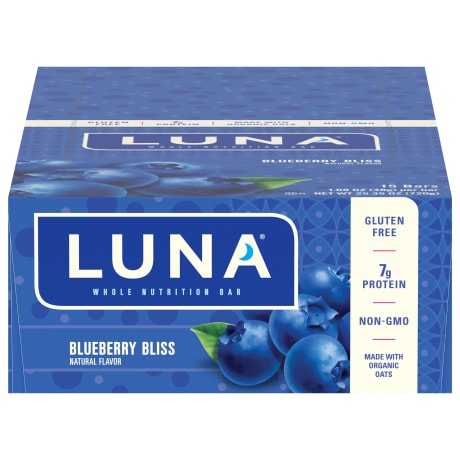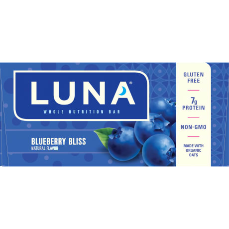 Made with organic rolled oats, organic cocoa, and organic coconut and offering 8 grams of plant based protein per bar, LUNA Bar Blueberry Bliss Gluten-Free Snack Bars are delicious protein snacks to help consumers fight off hunger during their busy day. Individually wrapped snacks are conveniently portable, making them perfect for on-the-go snacking occassions. Non-GMO and certified kosher, these gluten free protein bars contain no high-fructose corn syrup.