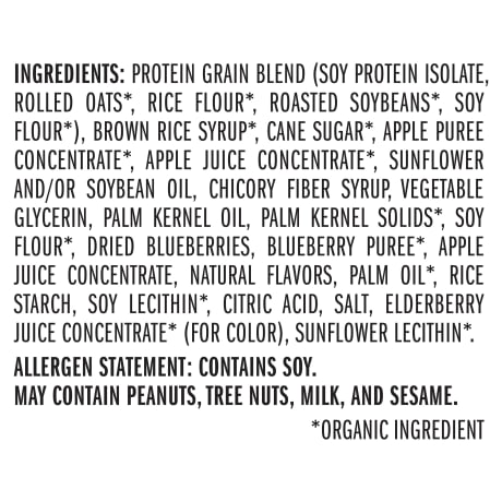 INGREDIENTS: PROTEIN GRAIN BLEND (SOY PROTEIN ISOLATE, ROLLED OATS*, RICE FLOUR*, ROASTED SOYBEANS*, SOY FLOUR*), BROWN RICE SYRUP*, CANE SUGAR*, APPLE PUREE CONCENTRATE*, APPLE JUICE CONCENTRATE*, SUNFLOWER AND/OR SOYBEAN OIL, CHICORY FIBER SYRUP, VEGETABLE GLYCERIN, PALM KERNEL OIL, PALM KERNEL SOLIDS*, SOY FLOUR*, DRIED BLUEBERRIES, BLUEBERRY PUREE*, APPLE JUICE CONCENTRATE, NATURAL FLAVORS, PALM OIL*, RICE STARCH, SOY LECITHIN*, CITRIC ACID, SALT, ELDERBERRY JUICE CONCENTRATE* (FOR COLOR), SUNFLOWER LECITHIN*.ALLERGEN STATEMENT: CONTAINS SOY.MAY CONTAIN PEANUTS, TREE NUTS, MILK, AND SESAME.