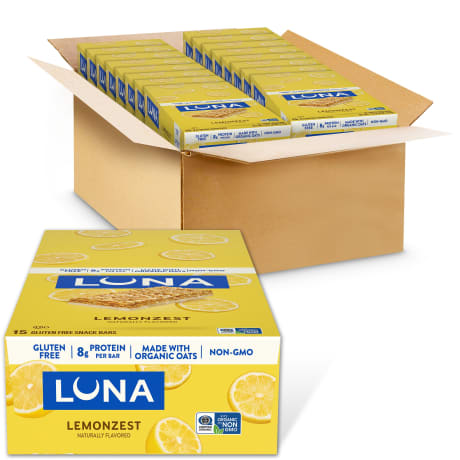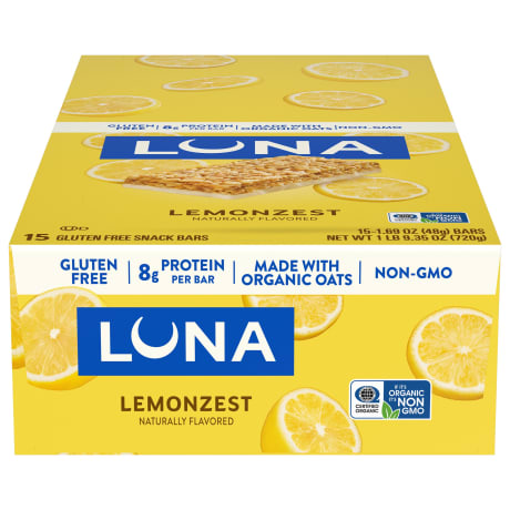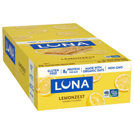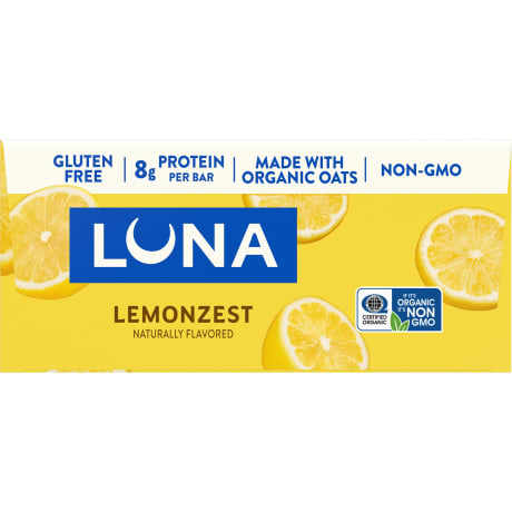 LUNA Bar Lemon Zest Gluten Free Snack Barrs are made with organic rolled oats, cocoa, and organic peanuts and offering 9 grams of plant based protein per bar, and are individually wrapped snacks so they're conveniently portable as an on-the-go snack for all dayparts. Non-GMO and certified kosher, these gluten free protein bars contain no high-fructose corn syrup.