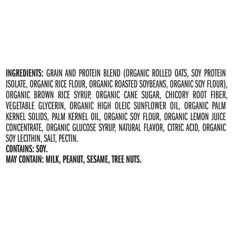 INGREDIENTS: GRAIN AND PROTEIN BLEND (ORGANIC ROLLED OATS, SOY PROTEIN ISOLATE, ORGANIC RICE FLOUR, ORGANIC ROASTED SOYBEANS, ORGANIC SOY FLOUR), ORGANIC BROWN RICE SYRUP, ORGANIC CANE SUGAR, CHICORY ROOT FIBER, VEGETABLE GLYCERIN, ORGANIC HIGH OLEIC SUNFLOWER OIL, ORGANIC PALM KERNEL SOLIDS, PALM KERNEL OIL, ORGANIC SOY FLOUR, ORGANIC LEMON JUICE CONCENTRATE, ORGANIC GLUCOSE SYRUP, NATURAL FLAVOR, CITRIC ACID, ORGANIC SOY LECITHIN, SALT, PECTIN. CONTAINS: SOY. MAY CONTAIN: MILK, PEANUT, SESAME, TREE NUTS.