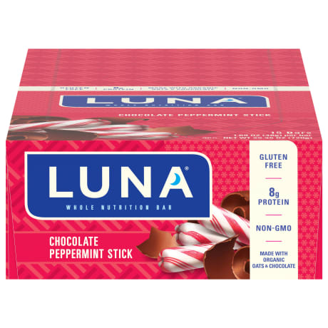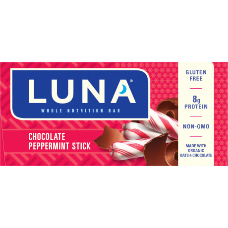 Made with organic rolled oats, organic cocoa, and organic coconut and offering 8 grams of plant based protein per bar, LUNA Bar Chocolate Peppermint Snack Bars are delicious protein snacks to help consumers fight off hunger during their busy day. Individually wrapped snacks are conveniently portable, making them perfect for on-the-go snacking occassions. Non-GMO and certified kosher, these gluten free protein bars contain no high-fructose corn syrup.