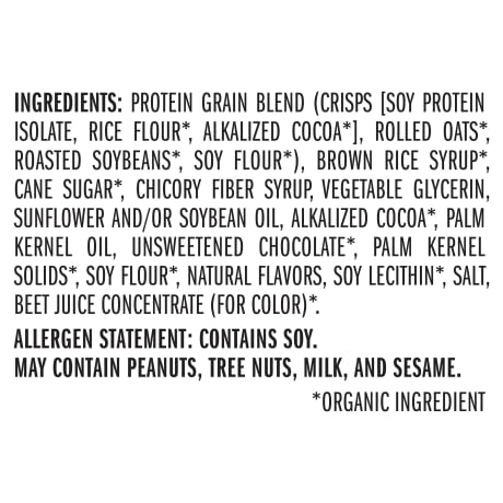 INGREDIENTS: PROTEIN GRAIN BLEND (CRISPS [SOY PROTEIN ISOLATE, RICE FLOUR*, ALKALIZED COCOA*], ROLLED OATS*, ROASTED SOYBEANS*, SOY FLOUR*), BROWN RICE SYRUP*, CANE SUGAR*, CHICORY FIBER SYRUP, VEGETABLE GLYCERIN, SUNFLOWER AND/OR SOYBEAN OIL, ALKALIZED COCOA*, PALM KERNEL OIL, UNSWEETENED CHOCOLATE*, PALM KERNEL SOLIDS*, SOY FLOUR*, NATURAL FLAVORS, SOY LECITHIN*, SALT, BEET JUICE CONCENTRATE (FOR COLOR)*.ALLERGEN STATEMENT: CONTAINS SOY.MAY CONTAIN PEANUTS, TREE NUTS, MILK, AND SESAME.