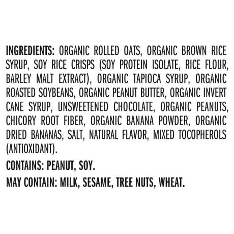 INGREDIENTS: ORGANIC ROLLED OATS, ORGANIC BROWN RICE SYRUP, SOY RICE CRISPS (SOY PROTEIN ISOLATE, RICE FLOUR, BARLEY MALT EXTRACT), ORGANIC TAPIOCA SYRUP, ORGANIC ROASTED SOYBEANS, ORGANIC PEANUT BUTTER, ORGANIC INVERT CANE SYRUP, UNSWEETENED CHOCOLATE, ORGANIC PEANUTS, CHICORY ROOT FIBER, ORGANIC BANANA POWDER, ORGANIC DRIED BANANAS, SALT, NATURAL FLAVOR, MIXED TOCOPHEROLS (ANTIOXIDANT). CONTAINS: PEANUT, SOY. MAY CONTAIN: MILK, SESAME, TREE NUTS, WHEAT.