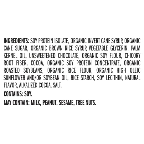 INGREDIENTS: SOY PROTEIN ISOLATE, ORGANIC INVERT CANE SYRUP, ORGANIC CANE SUGAR, ORGANIC BROWN RICE SYRUP, VEGETABLE GLYCERIN, PALM KERNEL OIL, UNSWEETENED CHOCOLATE, ORGANIC SOY FLOUR, CHICORY ROOT FIBER, COCOA, ORGANIC SOY PROTEIN CONCENTRATE, ORGANIC ROASTED SOYBEANS, ORGANIC RICE FLOUR, ORGANIC HIGH OLEIC SUNFLOWER AND/OR SOYBEAN OIL, RICE STARCH, SOY LECITHIN, NATURAL FLAVOR, ALKALIZED COCOA, SALT. CONTAINS: SOY. MAY CONTAIN: MILK, PEANUT, SESAME, TREE NUTS.