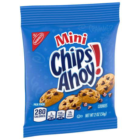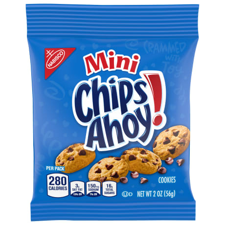 CHIPS AHOY! MINI Snack Size delivers the sweet, delicious cookie taste that America has loved since 1963. These tiny, bite-size crunchy cookies are made with real chocolate chips to satisfy any sweet tooth. Available in 60/2-oz. bags. Sell as-is or use in Chocolate Chip Cookie Milkshake made with CHIPS AHOY! Cookies.