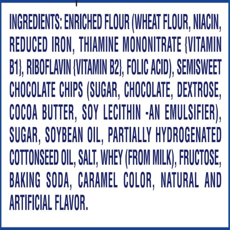 INGREDIENTS: UNBLEACHED ENRICHED FLOUR (WHEAT FLOUR, NIACIN, REDUCED IRON, THIAMINE MONONITRATE {VITAMIN B1}, RIBOFLAVIN {VITAMIN B2}, FOLIC ACID), SUGAR, CANOLA OIL, PALM AND PALM KERNEL OIL, COCOA (PROCESSED WITH ALKALI), HIGH FRUCTOSE CORN SYRUP, SALT, DEXTROSE, BAKING SODA, MILK, SOY LECITHIN, NATURAL AND ARTIFICIAL FLAVOR, CARAMEL COLOR.CONTAINS: WHEAT, MILK, SOY.