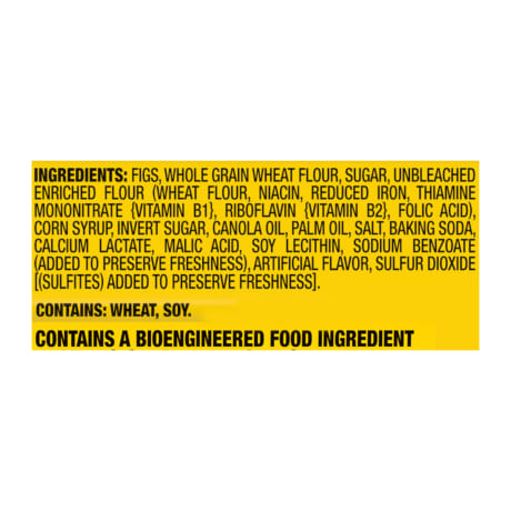 INGREDIENTS: FIGS, WHOLE GRAIN WHEAT FLOUR, SUGAR, UNBLEACHED ENRICHED FLOUR (WHEAT FLOUR, NIACIN, REDUCED IRON, THIAMINE MONONITRATE {VITAMIN B1}, RIBOFLAVIN {VITAMIN B2}, FOLIC ACID), CORN SYRUP, INVERT SUGAR, SOYBEAN AND/OR CANOLA OIL, PALM OIL, SALT, BAKING SODA, CALCIUM LACTATE, MALIC ACID, SOY LECITHIN, SODIUM BENZOATE (ADDED TO PRESERVE FRESHNESS), ARTIFICIAL FLAVOR, SULFUR DIOXIDE [(SULFITES) ADDED TO PRESERVE FRESHNESS].CONTAINS: WHEAT, SOY.