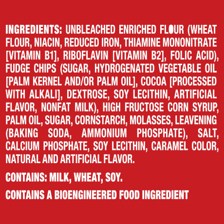 INGREDIENTS: UNBLEACHED ENRICHED FLOUR (WHEAT FLOUR, NIACIN, REDUCED IRON, THIAMINE MONONITRATE [VITAMIN B1], RIBOFLAVIN [VITAMIN B2], FOLIC ACID), FUDGE CHIPS (SUGAR, HYDROGENATED VEGETABLE OIL [PALM KERNEL AND/OR PALM OIL], COCOA [PROCESSED WITH ALKALI], DEXTROSE, SOY LECITHIN, ARTIFICIAL FLAVOR, NONFAT MILK), HIGH FRUCTOSE CORN SYRUP, PALM OIL, SUGAR, CORNSTARCH, MOLASSES, LEAVENING (BAKING SODA, AMMONIUM PHOSPHATE), SALT, CALCIUM PHOSPHATE, SOY LECITHIN, CARAMEL COLOR, NATURAL AND ARTIFICIAL FLAVOR. CONTAINS: MILK, WHEAT, SOY.