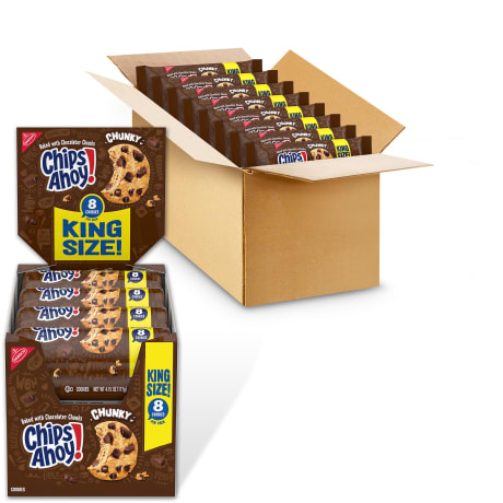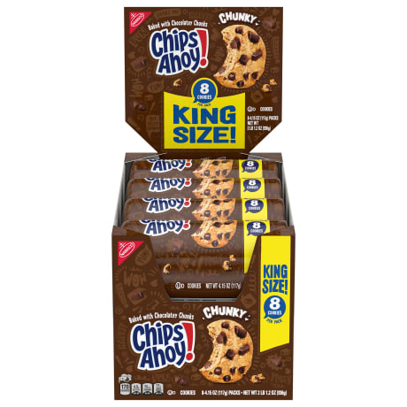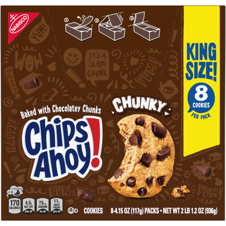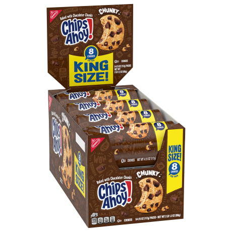 CHIPS AHOY! Chunky Chocolate Chip Cookies King Size delivers the sweet, delicious cookie taste that America has loved since 1963. These crowd-pleasing crunchy cookies have real chocolate chunks & chips to satisfy any sweet tooth. Available in 2/8, 4.15-oz packs. Sell as-is or use in Loaded Monster Cookie Ice Cream Sandwiches.