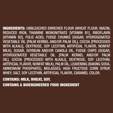 INGREDIENTS: UNBLEACHED ENRICHED FLOUR (WHEAT FLOUR, NIACIN, REDUCED IRON, THIAMINE MONONITRATE [VITAMIN B1], RIBOFLAVIN [VITAMIN B2], FOLIC ACID), FUDGE CHUNKS (SUGAR, HYDROGENATED VEGETABLE OIL [PALM KERNEL AND/OR PALM OIL], COCOA [PROCESSED WITH ALKALI], DEXTROSE, SOY LECITHIN, ARTIFICIAL FLAVOR, NONFAT MILK), SUGAR, SOYBEAN AND/OR CANOLA OIL, FUDGE CHIPS (SUGAR, HYDROGENATED VEGETABLE OIL [PALM KERNEL AND/OR PALM OIL], COCOA [PROCESSED WITH ALKALI], DEXTROSE, SOY LECITHIN, ARTIFICIAL FLAVOR, NONFAT MILK), PALM OIL, LEAVENING (BAKING SODA, AMMONIUM PHOSPHATE), MOLASSES, HIGH FRUCTOSE CORN SYRUP, WHEY, SALT, SOY LECITHIN, ARTIFICIAL FLAVOR, CARAMEL COLOR. CONTAINS: MILK, WHEAT, SOY.