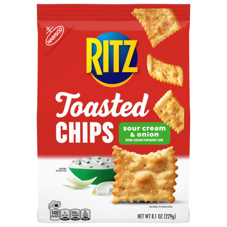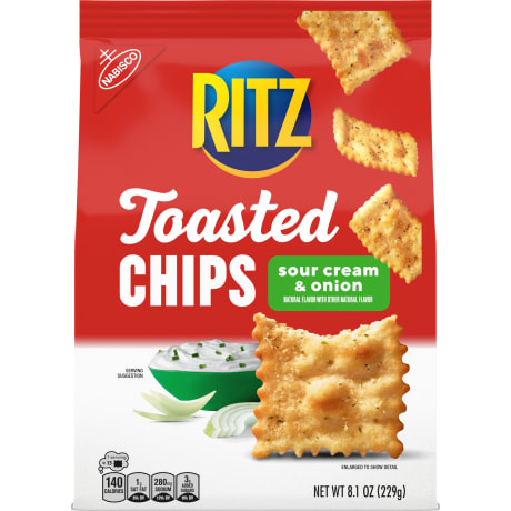 RITZ Toasted Chips Sour Cream and Onion are a crispy, wholesome snacking option that's made with 40% less fat than leading regular fried potato chips (6 grams of fat per serving vs. 10 grams). Available in 6/8.1-oz bags.