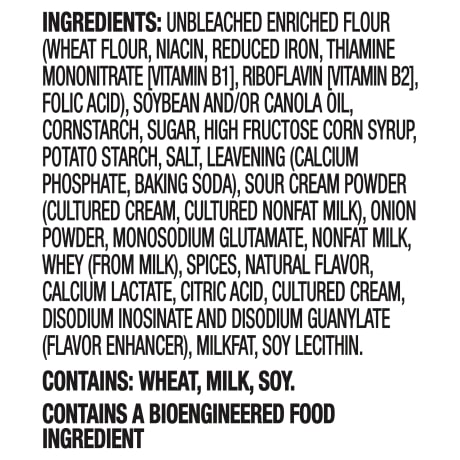 INGREDIENTS: UNBLEACHED ENRICHED FLOUR (WHEAT FLOUR, NIACIN, REDUCED IRON, THIAMINE MONONITRATE [VITAMIN B1], RIBOFLAVIN [VITAMIN B2], FOLIC ACID), SOYBEAN AND/OR CANOLA OIL, CORNSTARCH, SUGAR, HIGH FRUCTOSE CORN SYRUP, POTATO STARCH, SALT, LEAVENING (CALCIUM PHOSPHATE, BAKING SODA), SOUR CREAM POWDER (CULTURED CREAM, CULTURED NONFAT MILK), ONION POWDER, MONOSODIUM GLUTAMATE, NONFAT MILK, WHEY (FROM MILK), SPICES, NATURAL FLAVOR, CALCIUM LACTATE, CITRIC ACID, CULTURED CREAM, DISODIUM INOSINATE AND DISODIUM GUANYLATE (FLAVOR ENHANCER), MILKFAT, SOY LECITHIN.CONTAINS: WHEAT, MILK, SOY.