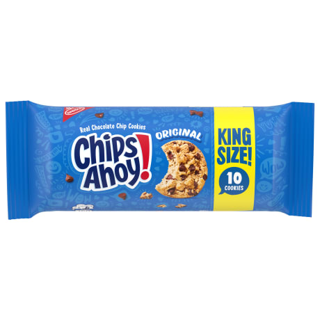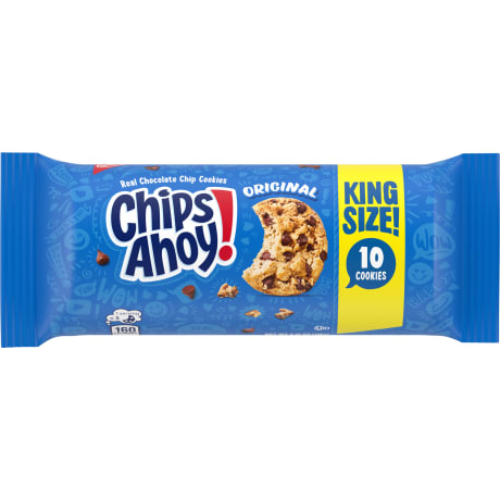 CHIPS AHOY! Original Chocolate Chip Cookies deliver the sweet, delicious cookie taste that America has loved since 1963. They're loaded with real chocolate chips to satisfy any sweet tooth. Bulk package contains 16 individually wrapped 4.15-oz. king-size snack packs (10 cookies per pack, 8 packs per box, 2 boxes total). Sell as-is or use in Brown Sugar Ice Cream with CHIPS AHOY! Cookies.