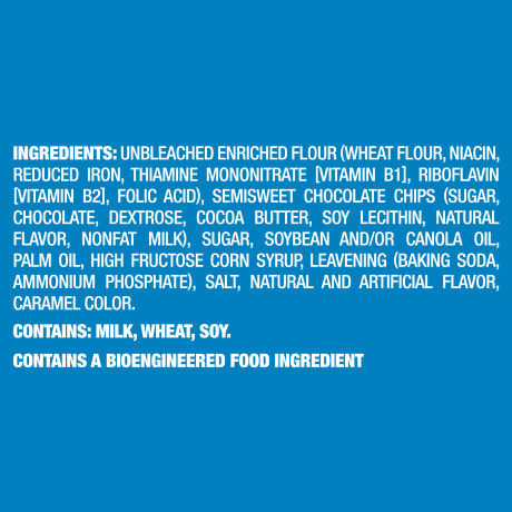 INGREDIENTS: UNBLEACHED ENRICHED FLOUR (WHEAT FLOUR, NIACIN, REDUCED IRON, THIAMINE MONONITRATE {VITAMIN B1}, RIBOFLAVIN {VITAMIN B2}, FOLIC ACID), SEMISWEET CHOCOLATE CHIPS (SUGAR, CHOCOLATE, COCOA BUTTER, DEXTROSE, MILK, SOY LECITHIN), SUGAR, SOYBEAN AND/OR CANOLA OIL, PALM OIL, HIGH FRUCTOSE CORN SYRUP, LEAVENING (BAKING SODA, AMMONIUM PHOSPHATE), SALT, NATURAL AND ARTIFICIAL FLAVOR, CARAMEL COLOR.CONTAINS: WHEAT, MILK, SOY.