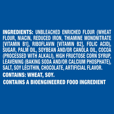 INGREDIENTS: UNBLEACHED ENRICHED FLOUR (WHEAT FLOUR, NIACIN, REDUCED IRON, THIAMINE MONONITRATE [VITAMIN B1], RIBOFLAVIN [VITAMIN B2], FOLIC ACID), SUGAR, PALM OIL, SOYBEAN AND/OR CANOLA OIL, COCOA (PROCESSED WITH ALKALI), HIGH FRUCTOSE CORN SYRUP, LEAVENING (BAKING SODA AND/OR CALCIUM PHOSPHATE), SALT, SOY LECITHIN, CHOCOLATE, ARTIFICIAL FLAVOR. CONTAINS: WHEAT, SOY.