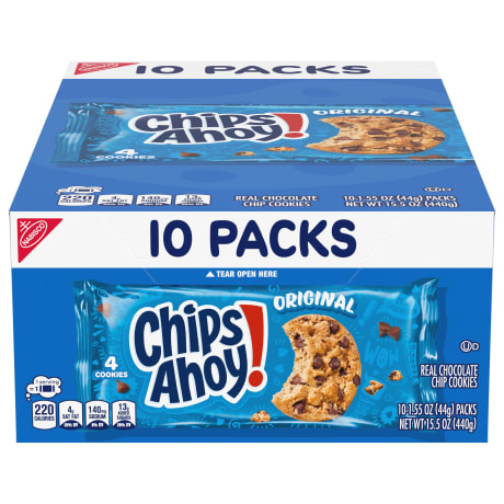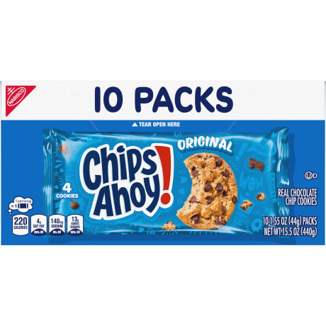 CHIPS AHOY! Chocolate Chip Cookies are loaded with real chocolate chips to satisfy any sweet tooth. Case contains 40 individually wrapped 1.55-oz. packs with 4 cookies each, making them perfect to sell in your non-commercial operation.