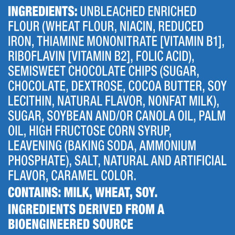 INGREDIENTS: UNBLEACHED ENRICHED FLOUR (WHEAT FLOUR, NIACIN, REDUCED IRON, THIAMINE MONONITRATE [VITAMIN B1], RIBOFLAVIN [VITAMIN B2], FOLIC ACID), SEMISWEET CHOCOLATE CHIPS (SUGAR, CHOCOLATE, DEXTROSE, COCOA BUTTER, SOY LECITHIN, NATURAL FLAVOR, NONFAT MILK), SUGAR, SOYBEAN AND/OR CANOLA OIL, PALM OIL, HIGH FRUCTOSE CORN SYRUP, LEAVENING (BAKING SODA, AMMONIUM PHOSPHATE), SALT, NATURAL AND ARTIFICIAL FLAVOR, CARAMEL COLOR.CONTAINS: MILK, WHEAT, SOY.