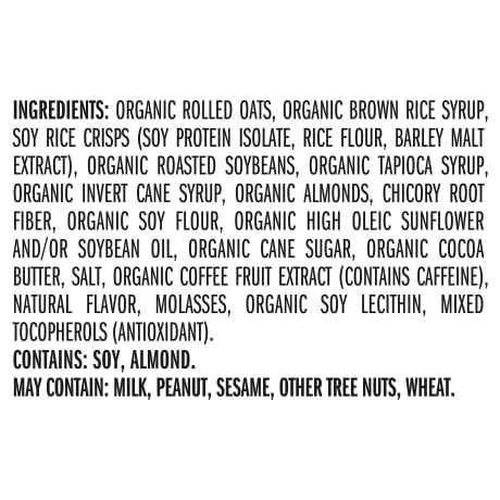 INGREDIENTS: ORGANIC ROLLED OATS, ORGANIC BROWN RICE SYRUP, SOY RICE CRISPS (SOY PROTEIN ISOLATE, RICE FLOUR, BARLEY MALT EXTRACT), ORGANIC ROASTED SOYBEANS, ORGANIC TAPIOCA SYRUP, ORGANIC INVERT CANE SYRUP, ORGANIC ALMONDS, CHICORY ROOT FIBER, ORGANIC SOY FLOUR, ORGANIC HIGH OLEIC SUNFLOWER AND/OR SOYBEAN OIL, ORGANIC CANE SUGAR, ORGANIC COCOA BUTTER, SALT, ORGANIC COFFEE FRUIT EXTRACT (CONTAINS CAFFEINE), NATURAL FLAVOR, MOLASSES, ORGANIC SOY LECITHIN, MIXED TOCOPHEROLS (ANTIOXIDANT). CONTAINS: SOY, ALMOND. MAY CONTAIN: MILK, PEANUT, SESAME, OTHER TREE NUTS, WHEAT.